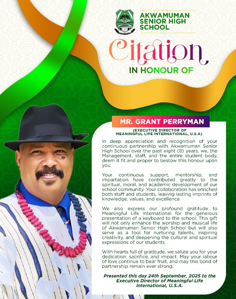 We were honored to have a presentation for Mr. Grant Perryman with a Special Citation at Akwamuman SHS, in recognition of his inspirational leadership and unwavering dedication to transforming lives across Ghana.